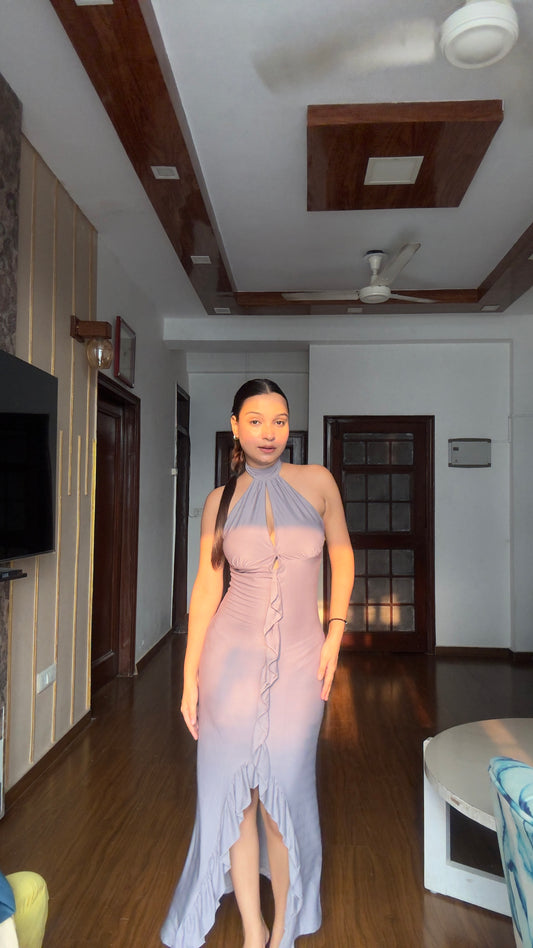 Lavaya Halterneck Ruffle-Trim Gown in Grey