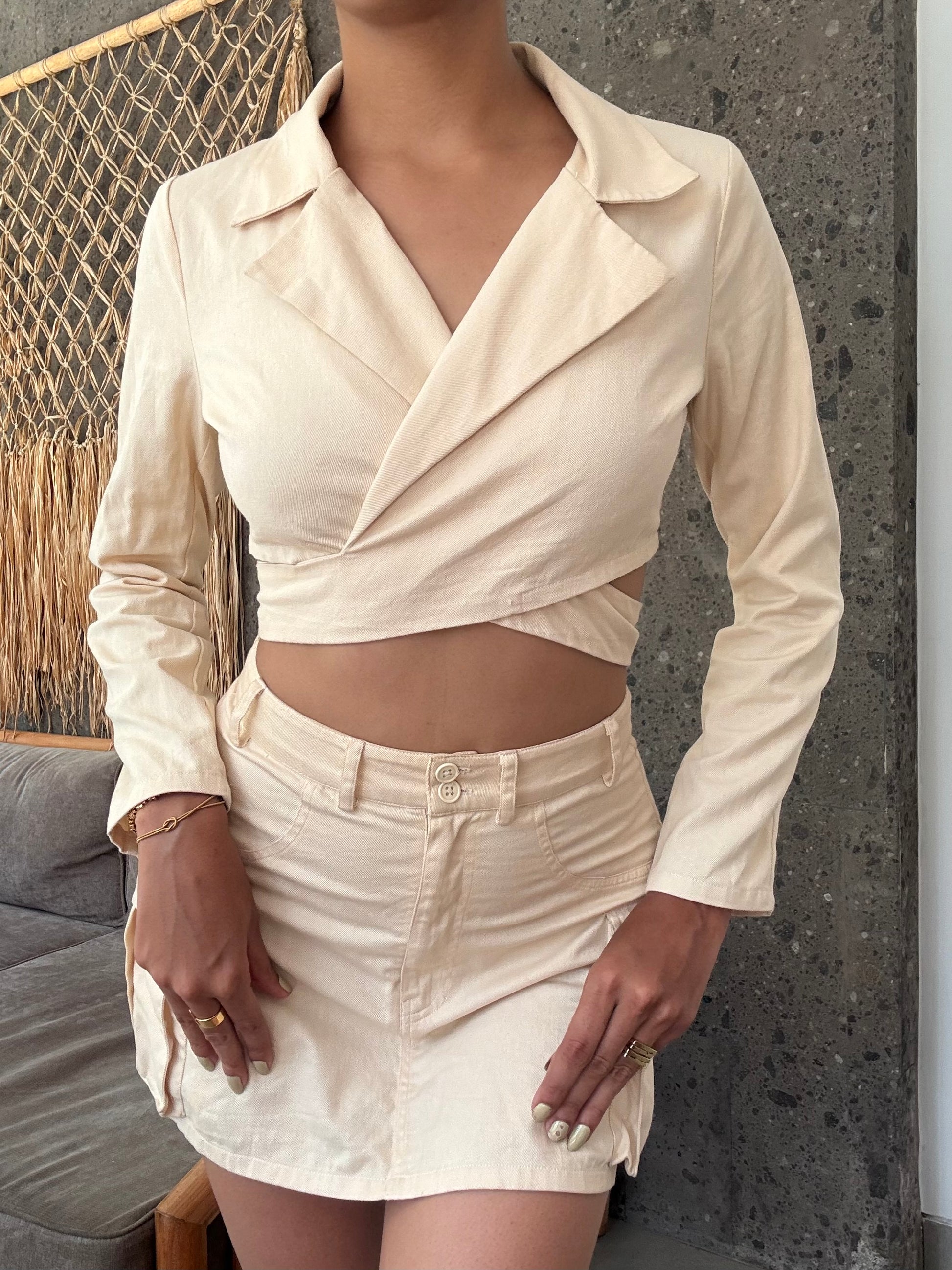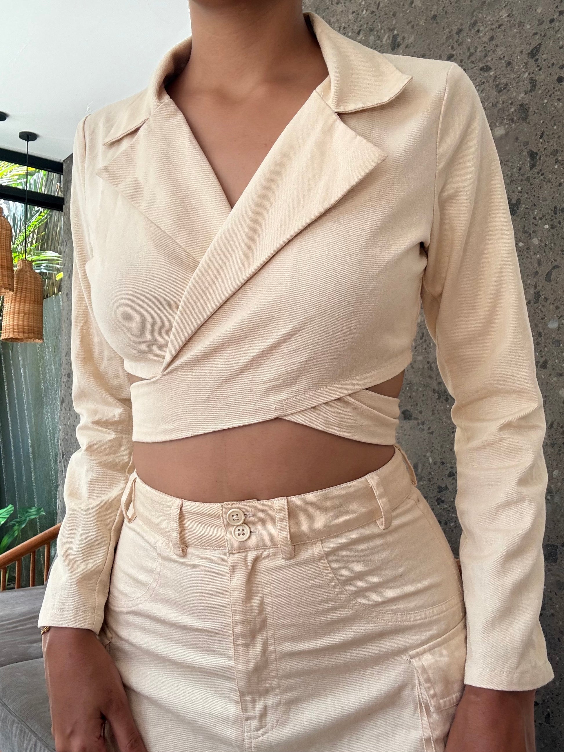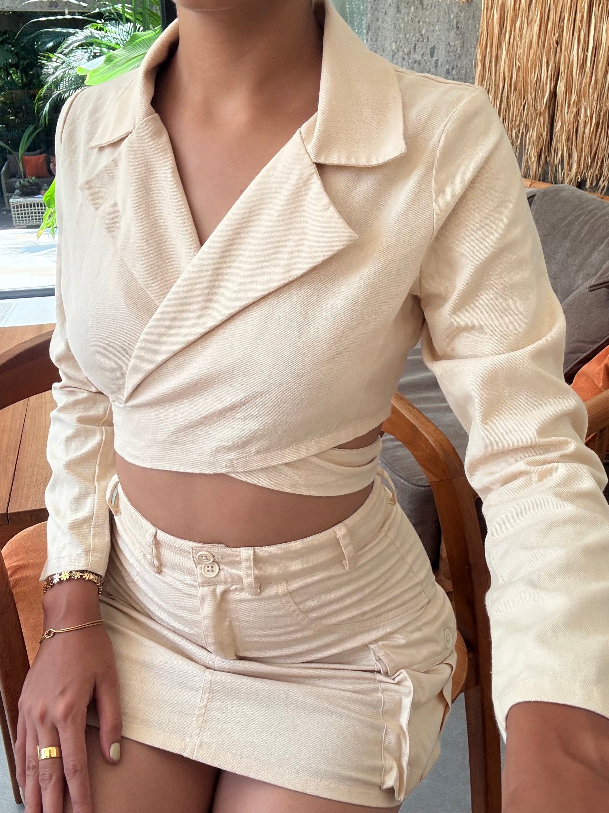 Top: A cropped, long-sleeve jacket with a trendy wrap design, giving a flattering yet modern silhouette.