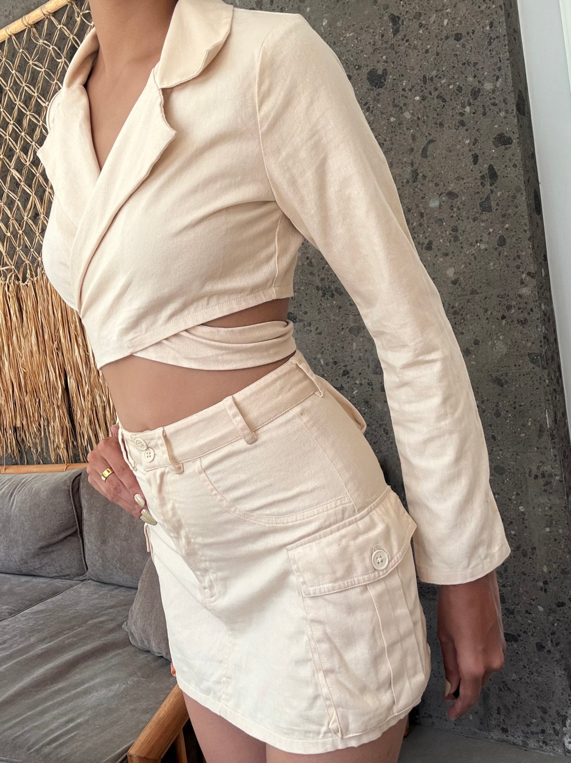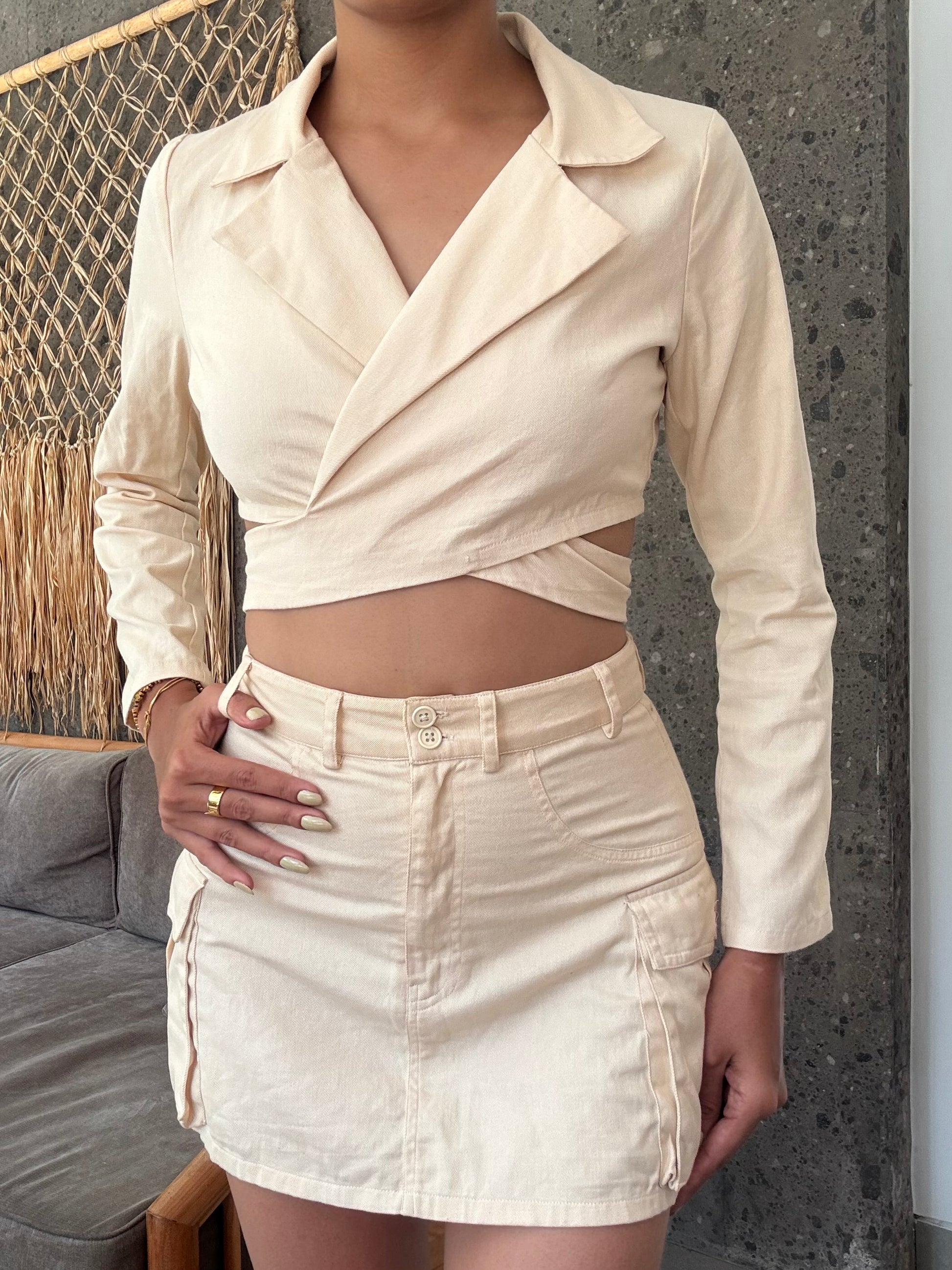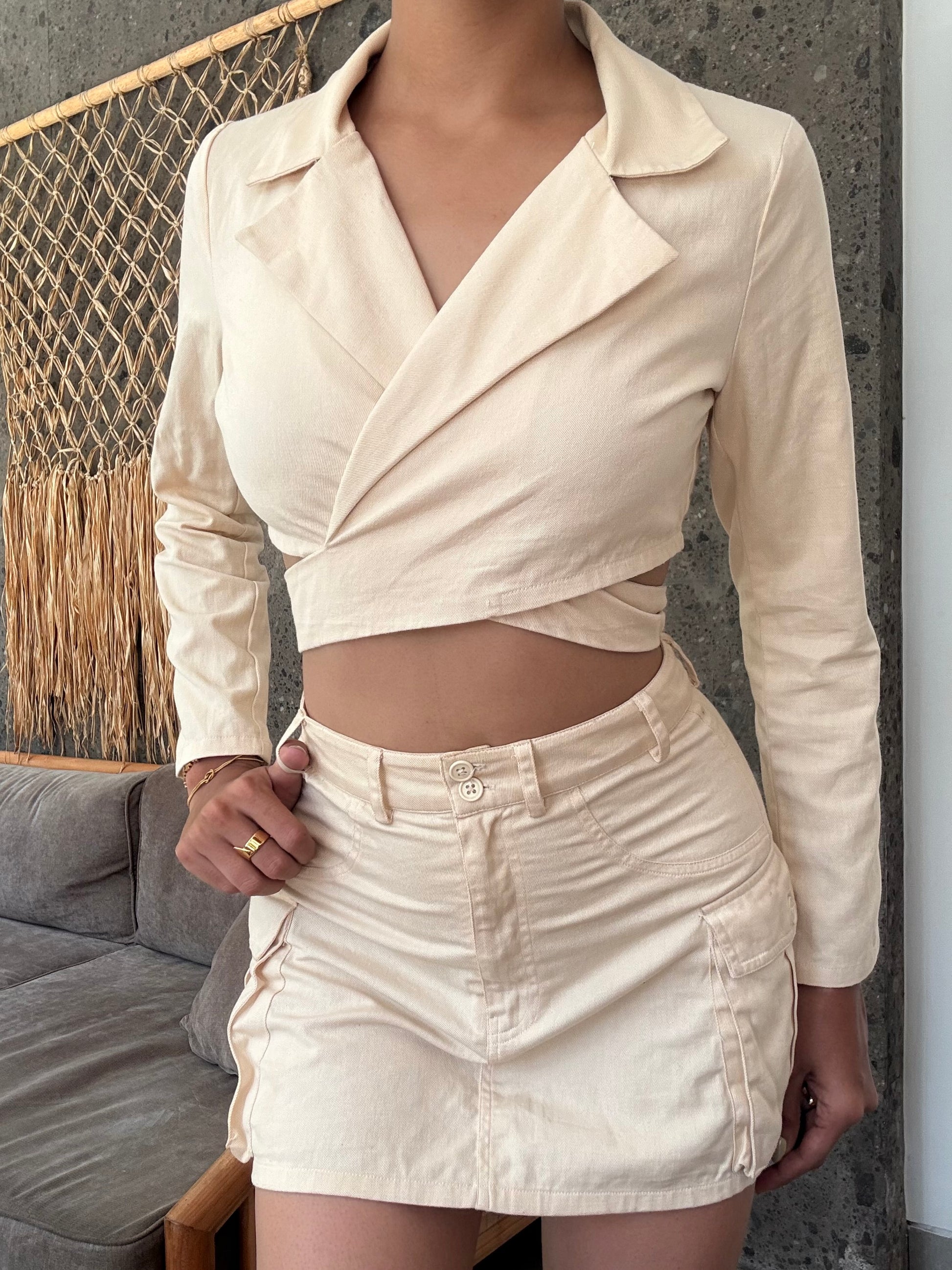 Top: A cropped, long-sleeve jacket with a trendy wrap design, giving a flattering yet modern silhouette.