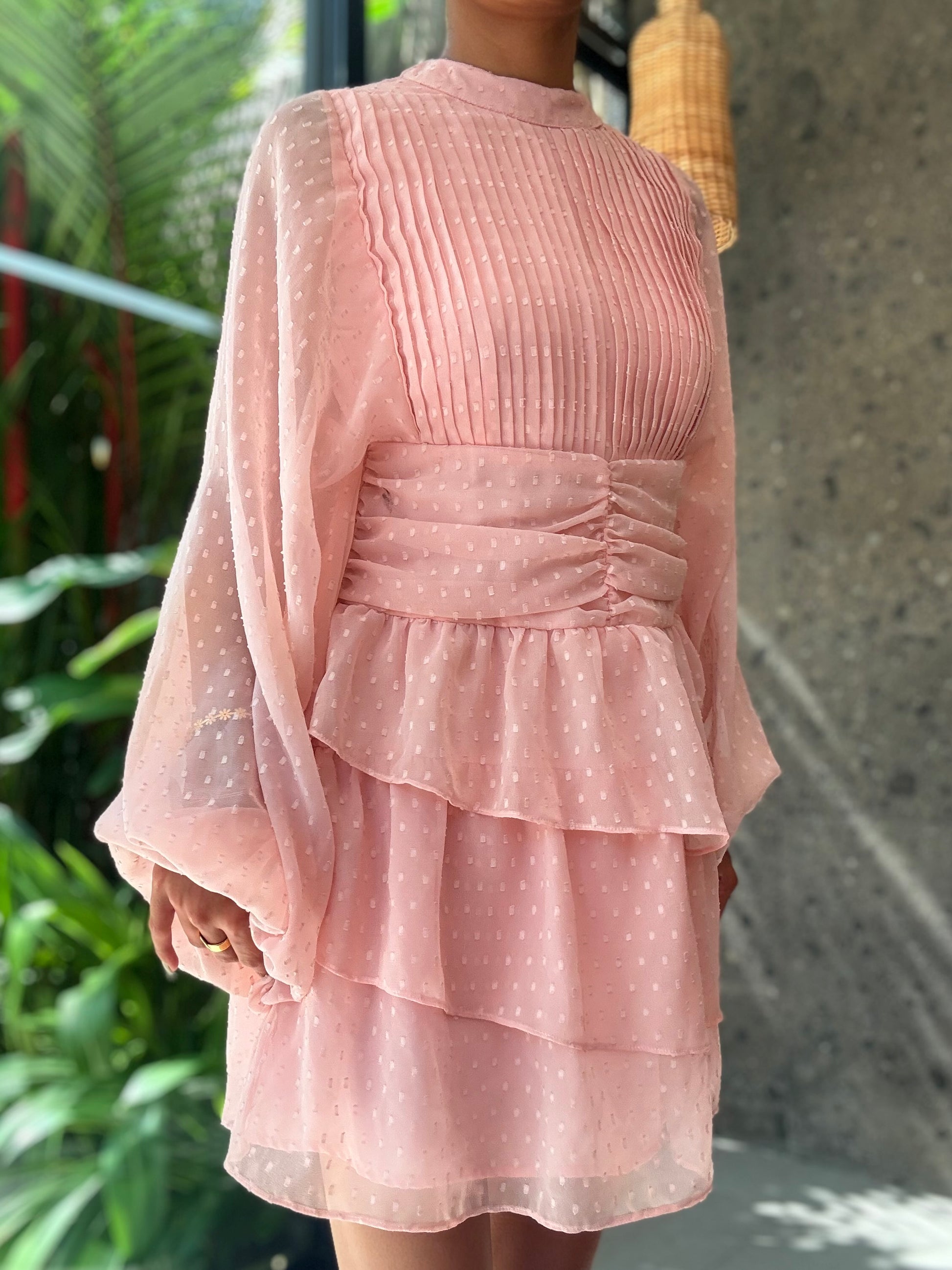 Sleeves: Billowy, sheer long sleeves with a dotted pattern, adding a touch of playfulness and romance.