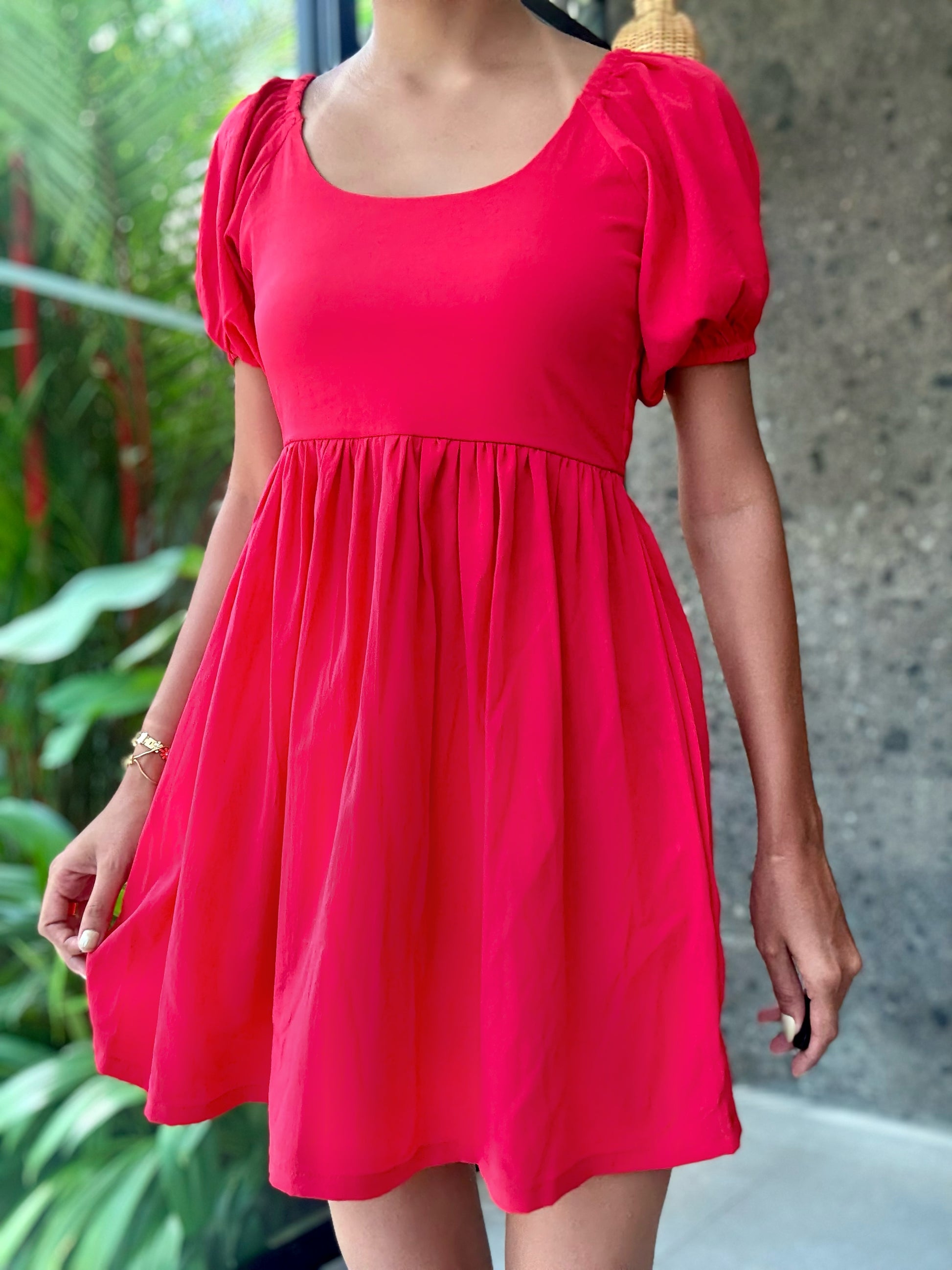 - Feature: smocking at back, Puff sleeve, soft, solid color, plain, Flared Dress.