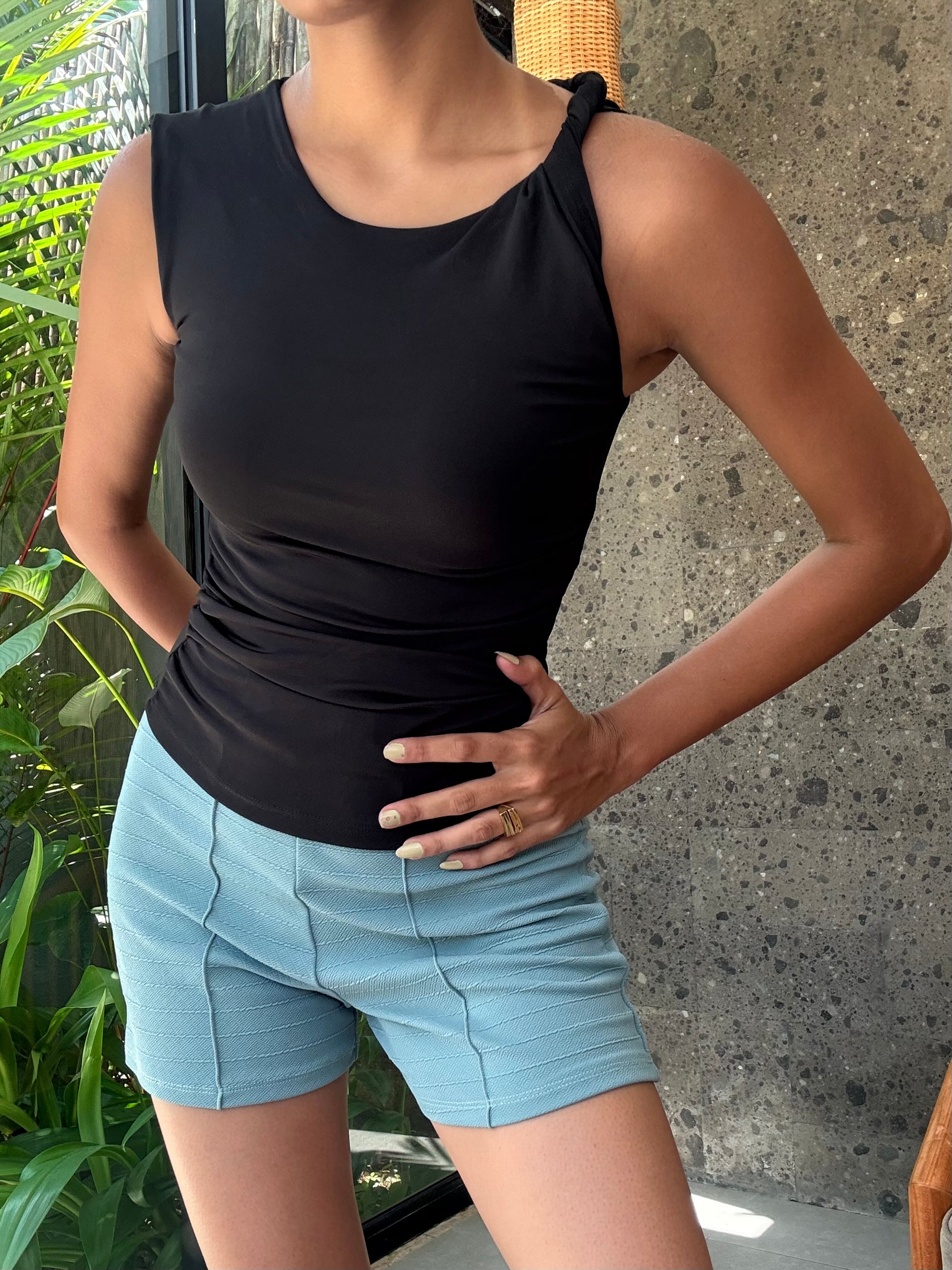 - Ponte knit fabric with moderate stretch
