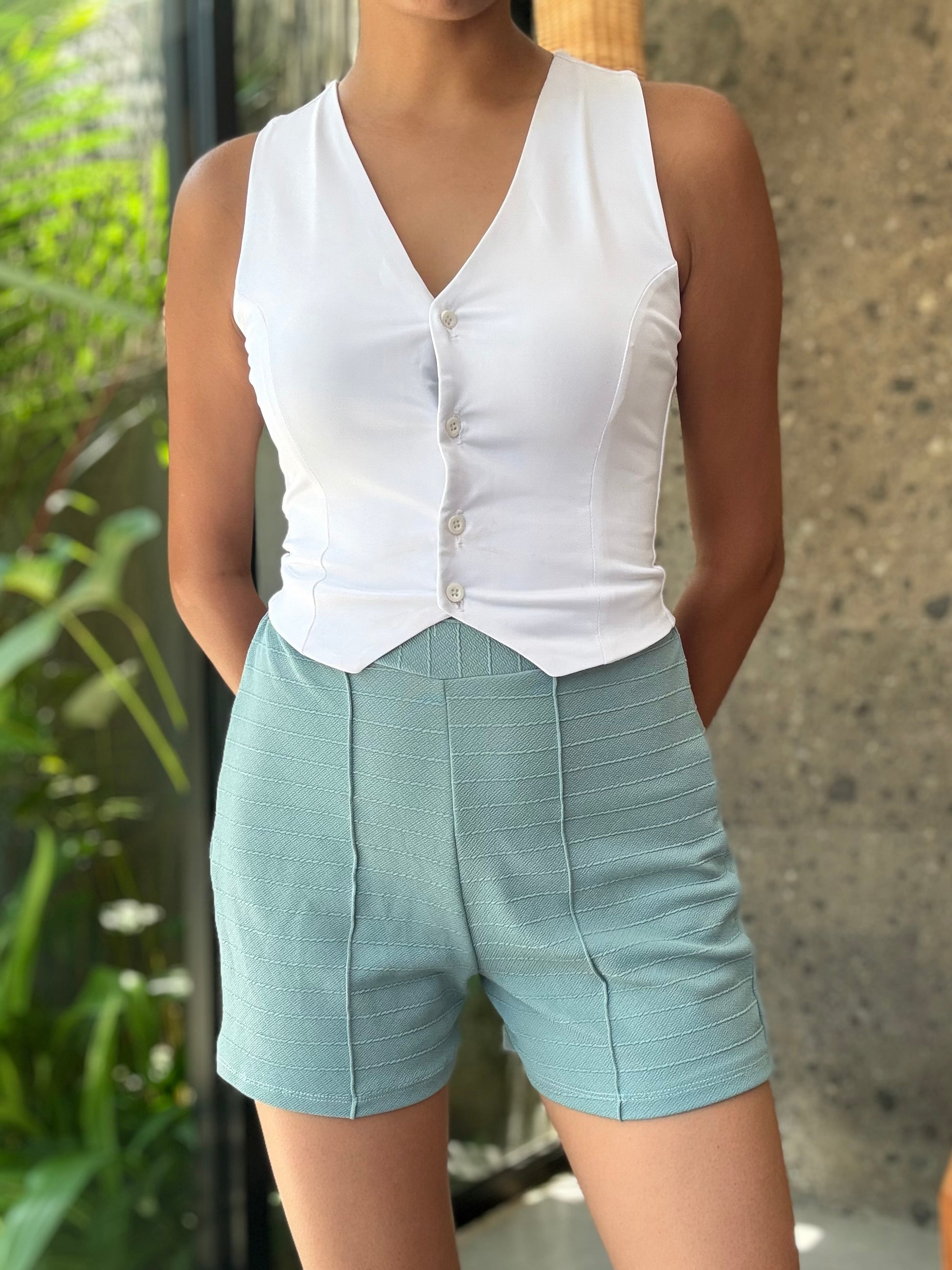 Elegant and Chic: A perfect blend of style and comfort, this set features a white button-up bodysuit and a pair of soft, mint-colored textured shorts.